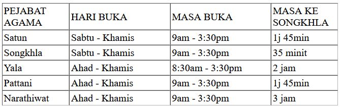 Catatan: "Masa ke Songkhla" adalah masa perjalanan ke Songkhla dari setiap Pejabat Agama di atas. Masa perjalanan ini penting sebab surat nikah perlu dapat surat pengesahan nikah daripada Konsulat Malaysia di Songkhla. Kalau tak ada surat pengesahan Konsulat, tak boleh daftar di Malaysia dan surat nikah tak diiktiraf di Malaysia. Urusan Konsulat tak boleh diwakilkan. Salah seorang yang nikah perlu pergi ke sana.